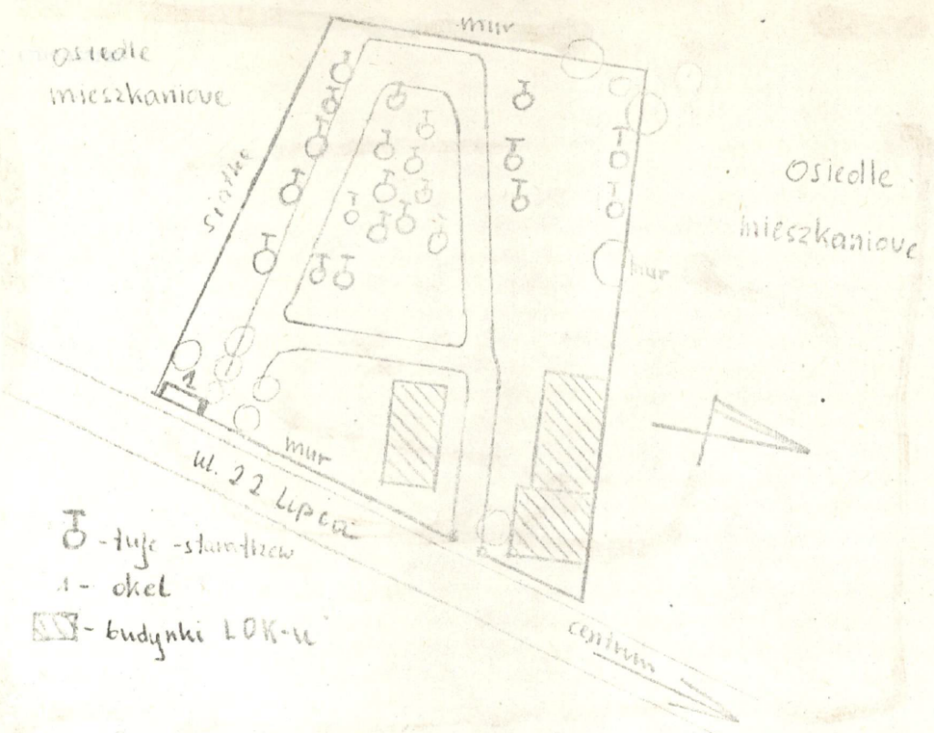 Szkic cmentarza z 1987 roku autorstwa Jacka Koja z oznaczonymi budynkami oraz rozmieszczeniem dróg placu panewrowego.