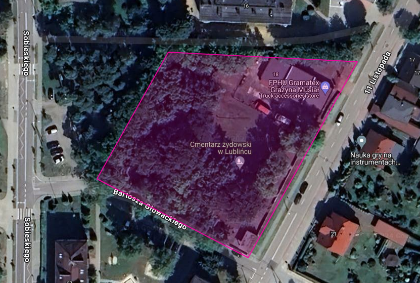 Obszar cmentarza żydowskiego w Lublińcu na zdjęciu satelitarnym Google Maps