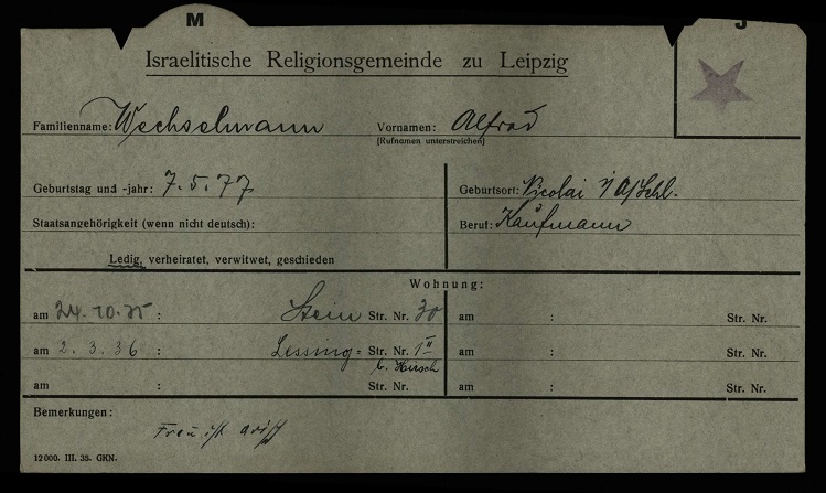 Wechselmannowie mieszkali w Lipsku przez całe lata trzydzieste. W marcu 1936 roku przeprowadzili się ze Steinstrasse 30 na Lessingstrasse 1, gdzie wynajmowali kwaterę u niejakiego Hirscha. Alfred jako Żyd po dojściu Hitlera do władzy poddawany był wszystkim wprowadzanym stopniowo ograniczeniom wynikającym z ustawodawstwa rasistowskiego. Podczas II wojny światowej przed deportacją do miejsca kaźni uchroniło go małżeństwo z kobietą, zakwalifikowaną jako aryjka czystej krwi niemieckiej.