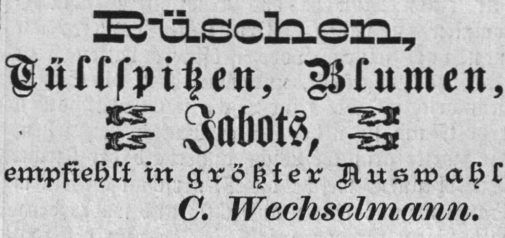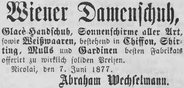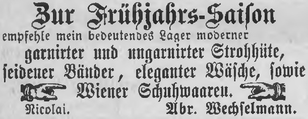 Abraham Wechselmann był w Mikołowie właścicielem niewielkiego sklepu, w którego asortymencie znajdowały się towary przeznaczone wyłącznie dla kobiet. Dzięki kilku reklamom, opublikowanym w 1877 roku na łamach gazety Oefentlicher Anzeiger für den Kreis Pless możliwe jest skromne prześledzenie, co jego skład oferował w tamtym czasie. A były to m.in. rękawiczki z glancowanej skóry, wiedeńskie obuwie, włókno na pończochy w różnych kolorach, parasole przeciwsłoneczne oraz towary białe (szyfon, szerting, muślin i firany). Poza tym kupiec przyjmował także do czyszczenia i wtórnego kształtowanie kapelusze filcowe.