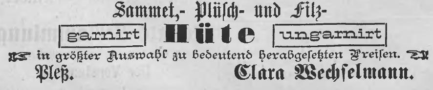 Pod koniec września 1884 roku w sklepie pojawiły się wiedeńskie buty skórzane oraz płaskie lakierki w kolorze złotym. Natomiast w okresie przed świętami Bożego Narodzenia polecane były jako prezent pod choinkę obszywki, żaboty, eleganckie chusty typu fichu, koronki, rękawiczki zamszowe lub z glancowanej skóry w fasonie wiedeńskim z bielskiej fabryki Schneidera, a także zupełnie nowe produkty w asortymencie tego sklepu, takie jak portmonetki, wizytowniki, broszki, ozdobne szpikulce do upinania włosów i bransoletki. W styczniu roku następnego z okazji zbliżającego się karnawału właścicielka zachęcała do zakupów różnorakich dodatków do sukni wieczorowych, a były to obszywki, koronki, wstążki, sztuczne kwiaty, rękawiczki, wachlarze i buty balowe.
