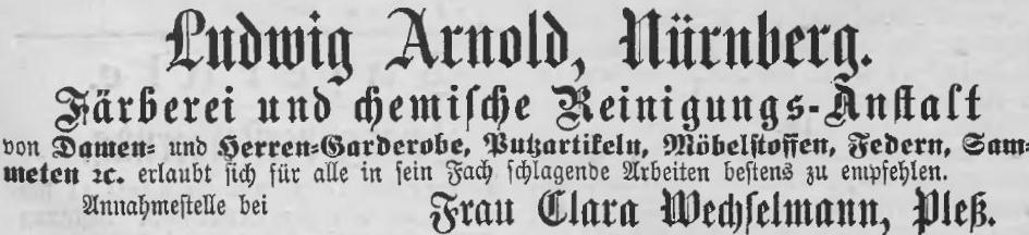 7 lipca 1885 na łamach lokalnej prasy pojawiło się ogłoszenie o nawiązaniu przez Clarę Wechselmann współpracy z założoną w 1854 roku firmą Färberei und chemischen Reinigungs-Anstalt, należącą do Ludwiga Arnolda z Norymbergi (Nürnberg). Dzięki temu w Pszczynie otwarto farbiarnię i pralnię chemiczną, w związku z czym właścicielka przyjmowała od tej pory zamówienia na usługi farbowania damskiej i męskiej garderoby wszelkiego rodzaju, tkanin obiciowych, pluszu, firan, jedwabiu, aksamitu czy piór. Poza wymienionymi wcześniej, możliwość chemicznego czyszczenia dotyczyła również dywanów, kołder, pled oraz marynarek.