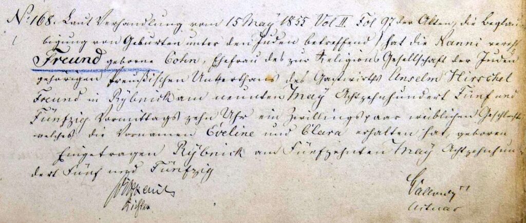 Metryka urodzenia Clary Freund i jej bliźniaczej siostry Eveliny (zasoby Archiwum Państwowego w Katowicach)