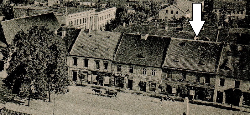 Fragment południowej pierzei pszczyńskiego Rynku na początku XX wieku. Strzałką wskazana została kamienica nr 13, w której Clara Wechselmann prowadziła swoje atelier modniarskie